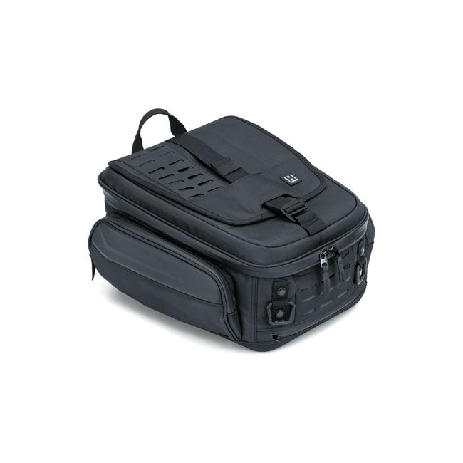 A multifunctional tail bag with versatility, style, and convenience on or off-bike. The ultimate commuter bag for everyday riding or short overnight getaways. Features include a contoured bottom for the best fit on rear fenders or passenger seats and includes an integrated shoulder strap for off-bike transport. • Dimensions: 15″ (38cm) wide x 15″ (38cm) deep x 9.5″ (24.1cm) high • Cubic Inches: 1.530 (25 liter) • Contoured and thermoformed bottom for strength, structure, and secure mounting • Integrated fixed shoulder strap stows away discreetly when not in use • Shoulder strap and wide grab handle offer easy transport off the bike • Side-mounted quick stash pockets for keeping smaller items organized • Built-in coat flap with adjustable G-Hook for quick and easy external storage